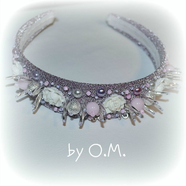 А у меня новое увлечение:) Расшиваю ободки: бусинами, бисером, стеклярусом. в общем, даю простор фантазии:) Был опыт создания короны: кружево прокрашивается краской для ткани с серебристым эффектом, расшивается стразами и кристаллами, а потом нейлоновой ниткой пришивается к ободку в тон. Смотрите что получилось:)