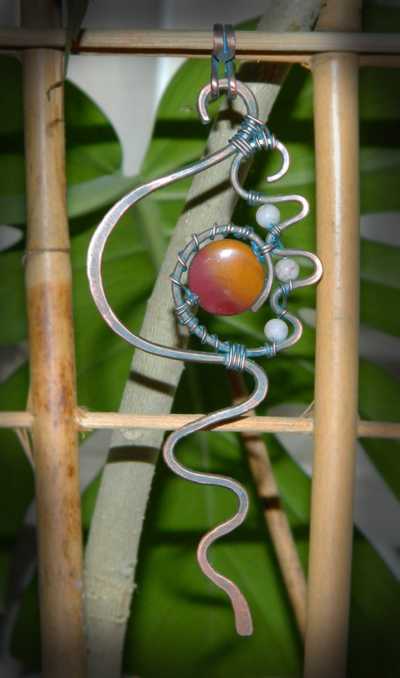 Что - то совсем давно не брала в руки проволоку и вот кое что сотворила :) Бусина лэмпворк из из стекла небесного цвета оплетена медной проволокой. Витиеватые узоры похожи на корешки этого изысканного и таинственного растения. Маленькая стрекозка прилетела полюбоваться на него. Бейл ручной работы Анна Черных и кожаный небесно-голубой шнурочек ...