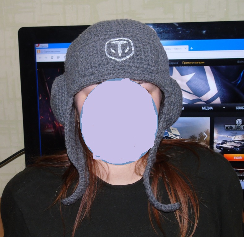 Вот... Почти связался подарок товарищу на д.р. теперь муж ноет, что ему тоже срочно такой надо и он даже согласен в танчики начать играть... скажу больше: Я понимаю, что и МНЕ такой шлем совершенно необходим по даче гонять и на горке кататься, в нем жутко удобно, затылок,уши и лоб прикрыты толстым слоем синтепона(не страшно грохнуться об лёд) Не знаю, как я жила без него раньше... хожу в нем по дому и снимать не хочется.. короче кто захочет связать - спрашивайте, я теперь спец по шлемам