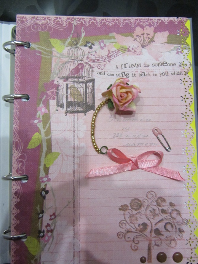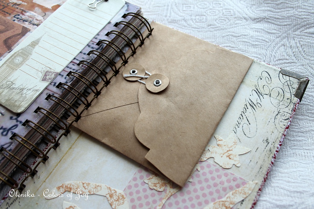 Зачем их переворачивать? и почему новые нормально без переворачивания набираются на штамп? - потому что пока их в губке много и так хорошо. И переворачивание станет для вас актуальным нескоро, ведь чернил довольно много и их надолго хватает. Однако к тому времени когда понадобится такое хранение вы уже прочно привыкнете к другому виду и будете забывать , такова уж человеческая природа))) Но это ваши штампы и ви таки можете делать с ними што вам угодно))) Почему одни растекаются, другие нет, одни жиденькие, другие густые? - разная основа. Чернила бывают масляные, пигментные, на водной основе, на спиртовой, на основе растворителя. Вероятней всего вы пользуетесь пигментными, они жирненькие, с плотным цветом. Дистрессы от Ranger - на водной основе, ими даже как акварелью можно отштамповки раскрашивать, они совершенно другие по консинстенции - что никак не сказывается на качестве штампинга. Почему на штамп чернила рекомендуется наносить похлопыванием подушечкой? Чтобы не было избытка краски. Если дистрессы обильно нанесенные немного смажут четкость оттиска, то много пигментных и жирных чернил останутся на бумаге толстыми жирными линиями. Вполне возможно, что пока у скрапера ещё небольшой ассортимент чернил и штампов, все эти тонкости излишни, и только забивают голову. Может быть всё это надо приобрести своим опытом... Если кому то это интересно у меня есть обзоры разновидностей чернил по производителям и составам. Лично мне было полезно немножко разобраться в их огромном многообразии, чтобы не застывать растерянно перед витриной с подушечками, и знать чем они отличаются между собой. Ох, с утра у меня много слов)))) Я вообще зачем пришла? - показать свою детку новую! Девочки, я сделала смэш! Хочется назвать его человеческим понятным словом но пока не подберу ничего)))) только этим и обзывается)))) Итак, что натворилось: блокнот-альбом-дневник для записей-вырезов-рисунков. В нем есть листы для писанины и рисования - тонированы в чае и украшены отштамповками, через каждые 5 листиков страница из бумаги с принтом, украшенная красками, белым акрилом, краской - этакий арт-фон. Декорированы эти фоны вырезками, цветами, васи-скотчем, глитером, конвертиками, марками... Есть две акриловые страницы - готовый оверлей из набора Глитц( фирма-производитель) - большие акриловые карты с красивыми рисунками. Для примера прицепила несколько прищепочек, которые можно использовать держателями элементов. В Конце альбома-блокнота есть конвертик, в который я вложила стикеры и уголки для фото. Вложение: Собран на пружину, за счет размера позволяет зацеплять за себя ручку, не теряется, проверено)))