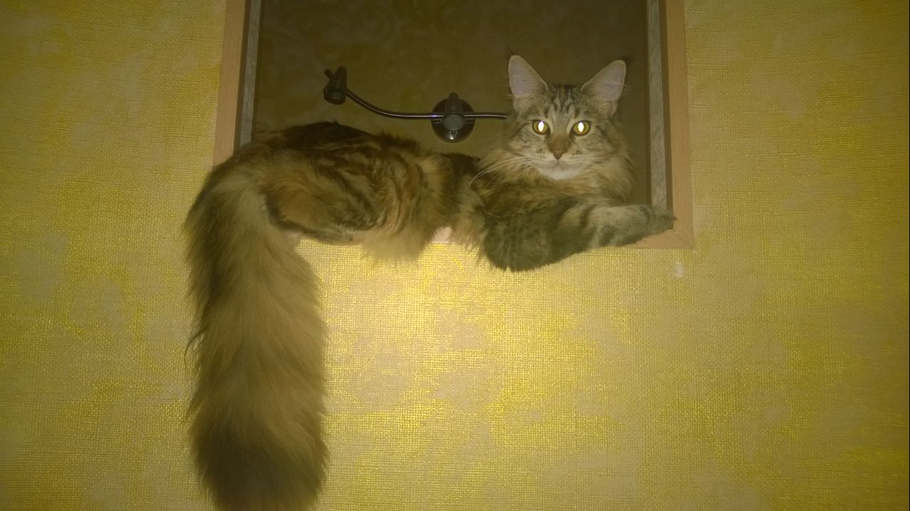 Наш Юпи (мейн кун) еще обязательно за всеми следит, пошли в ванну купаться - он идет и проверяет что там творится, все на диване, он на спинке сидит, на кухне и он идет наблюдать. Да еще есть у него какой то звук, вот не мяу а совсем другой, думаю именно его и называют языком мейнкунов.