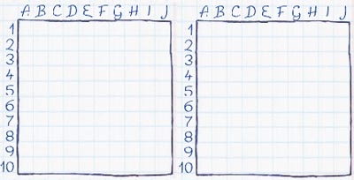 два поля: 10х10 клеток и пронумерованные по очереди сверху вниз, а слева направо- по алфавиту