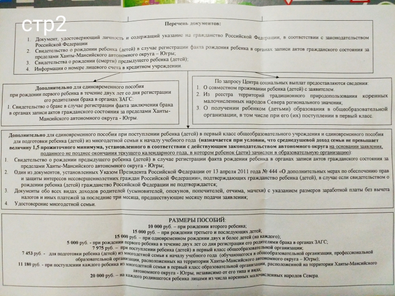 Единовременное пособие при рождении первого ребенка в течение двух лет со дня регистрации брака родителей. Полагается, если один из родителей проживал на территории Югры не менее 10 лет Развернуть/свернутьРазмер пособия -5000р