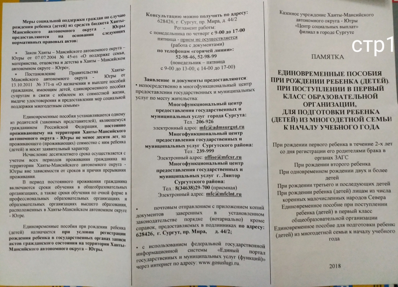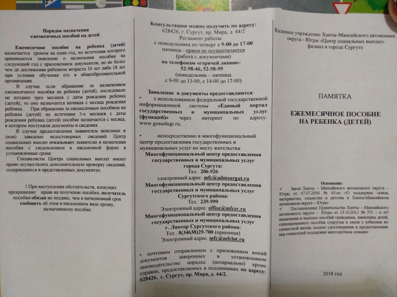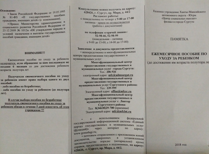 Все очень подробно о пособиях на сайте "Деткино" -> и Управления социальной защиты населения по г.Сургуту и Сургутскому району г.Сургут, пр. Мира, 44/2, (3 этаж) Телефон: 52-98-99, 52-98-46 http://uszn.surgut.ru/node/73 ФСС г.Сургут г.Сургут, ул. Ленина, д. 43 Телефон: (3462)36-32-54, 36-31-81 http://fss.ru/ru/consultation/index.shtml последнее редактирование февраль, 2018г |