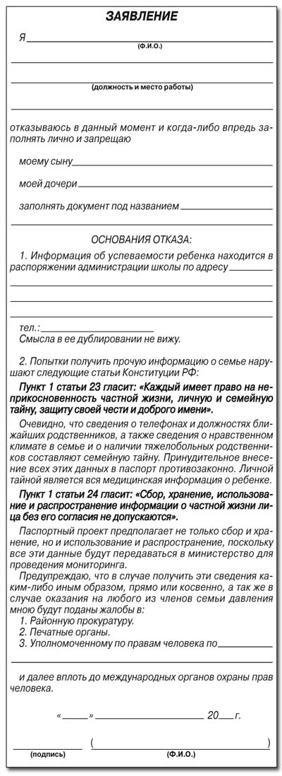 Отказ родителей от заполнения паспорта нередко вызывает угрозы со стороны чиновников от образования передать дело в органы опеки и попечительства для принятия мер, так как для них это означает, что семье есть, что скрывать. Всё это вопиющим образом нарушает права граждан. Конституция РФ в статье 23 провозглашает право каждого на неприкосновенность частной жизни, личную и семейную тайну, защиту своей чести и доброго имени. В соответствии со статьёй 24 Конституции РФ сбор, хранение, использование и распространение информации о частной жизни лица без его согласия не допускаются. Более того, часть 1 статьи 11 Федерального закона «О персональных данных» не допускает обработку персональных данных, касающихся состояния здоровья граждан. Аналогично данный вопрос решается и в Основах законодательства РФ об охране здоровья граждан, статья 61 которого относит информацию о факте обращения за медицинской помощью, состоянии здоровья гражданина, диагнозе его заболевания и иные сведения, полученные при его обследовании и лечении, к врачебной тайне и гарантирует гражданину конфиденциальность передаваемых им сведений. Согласно статье 64 Семейного кодекса РФ законными представителями несовершеннолетних являются их родители. Это означает, что сведения о состоянии здоровья ребенка могут быть помещены в паспорт здоровья школьника только с согласия его родителей. Кроме того, из указанных правовых актов следует, что само введение паспорта здоровья школьника как документа, обязательного к заполнению учащимися, не основано на законе. |