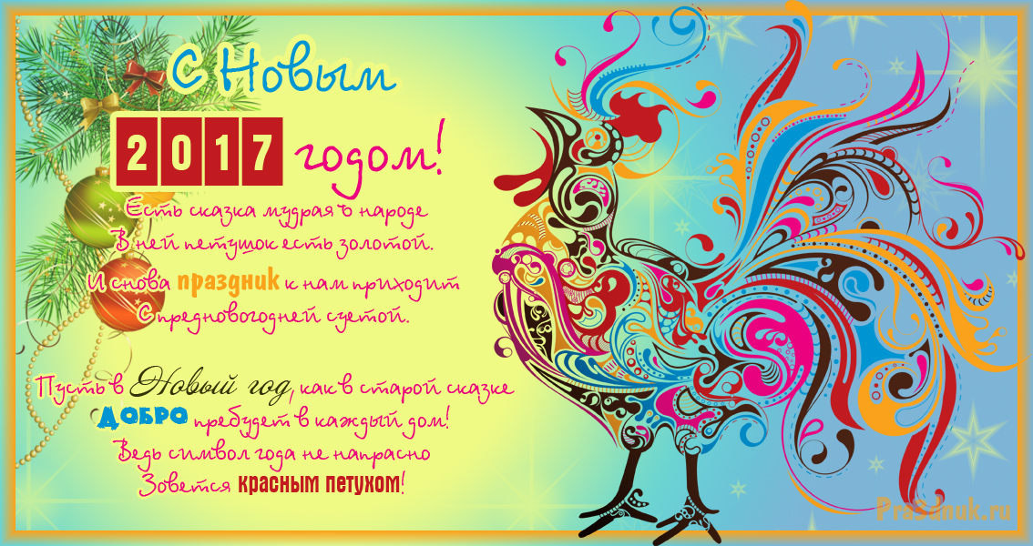 Петух спешит уже вприпрыжку! Он, Обезьянку взяв под мышку, Здоровье, счастье всем несет. Деньжат нам даст, от бед спасет. Радость и мир, успех, везенье, Азарт, победы, настроение, Веселье дарит и терпение! Он о любви нам песнь споет, Каждый удачу с ним найдет.