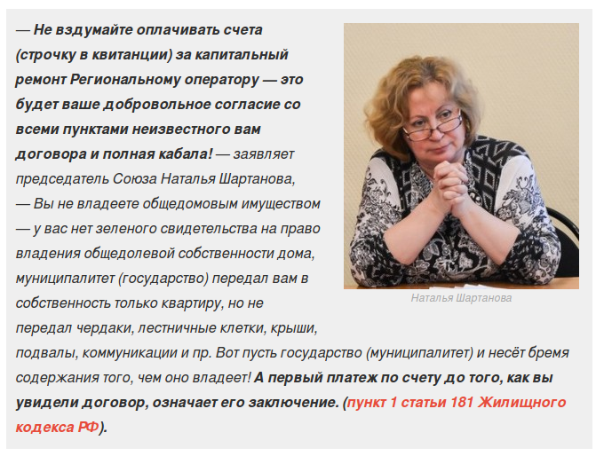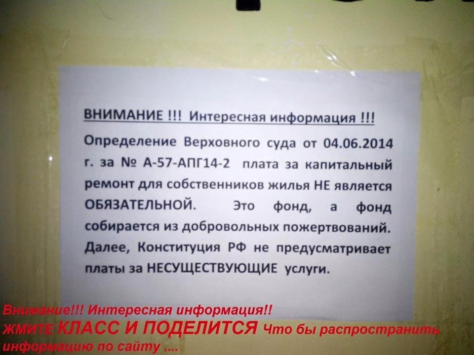 radistka писал(а): : 9.11.2016 14:45 Zvezdoчka писал(а): :09 ноя 2016, 12:23 №1539 Вот такие письма люди пишут и пункт о КапРем. из расчеток убирают... честно, не верится что-то нет прецедентов еще, чтобы освобождали от уплаты за капремонт. И да. мне тоже интересно, что ответили на такое письмо? написать то много чего можно... Убрали из расчетки пункт о кап. ремонте - со слов того кто писал... Вообще знаю, что многие выигрывают суды т.к. сборы носят добровольный характер, до тех пор пока собственник не внес 1 платеж и автоматом не заключил договор... В ОК и ВК есть много групп, где люди консультируются с юристами, рассказывают о своем опыте решения этого вопроса, куда обращались, что делали и т.д |