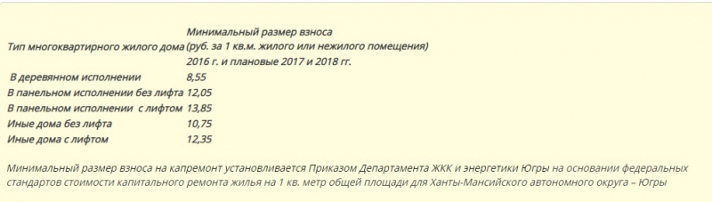 "Об организации проведения капитального ремонта общего имущества в многоквартирных домах, расположенных на территории Ханты-Мансийского автономного округа - Югры" http://www.rg.ru/2013/07/19/hmao-zakon54-reg-dok.html http://kapremontugra.ru/ http://kapremontugra.ru/index.php/for-owners/questions Часто задаваемые вопросы Выставляемый в ежемесячных квитанциях счет может отличаться у жителей разных домов – для определения суммы ответственные структуры используют следующие данные: Развернуть/свернутьВозраст постройки. Само собой, что для ремонта дома, сданного в прошлом году, не требуется собирать большую сумму. И наоборот – для дореволюционных построек размер взноса, логично, будет выше.