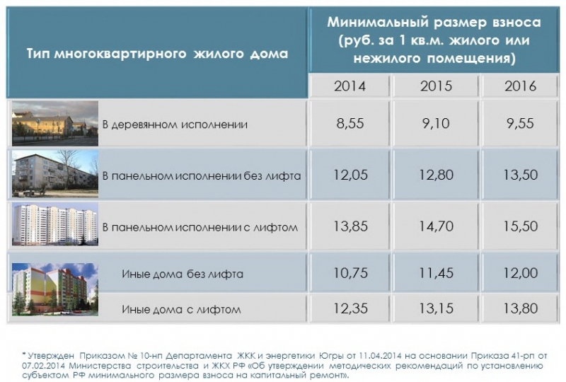 "Об организации проведения капитального ремонта общего имущества в многоквартирных домах, расположенных на территории Ханты-Мансийского автономного округа - Югры" http://www.rg.ru/2013/07/19/hmao-zakon54-reg-dok.html http://kapremontugra.ru/ http://kapremontugra.ru/index.php/for-owners/questions Часто задаваемые вопросы Выставляемый в ежемесячных квитанциях счет может отличаться у жителей разных домов – для определения суммы ответственные структуры используют следующие данные: Развернуть/свернутьВозраст постройки. Само собой, что для ремонта дома, сданного в прошлом году, не требуется собирать большую сумму. И наоборот – для дореволюционных построек размер взноса, логично, будет выше.