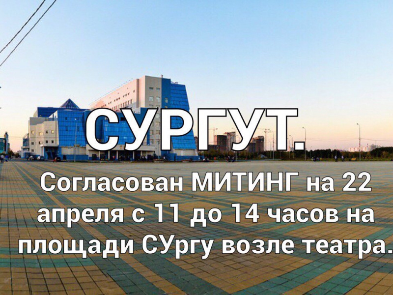 СУРГУТ. Нам официально согласовали митинг на 22 апреля с 11 до 14 часов на площади СУргу возле театра. До 500 человек.