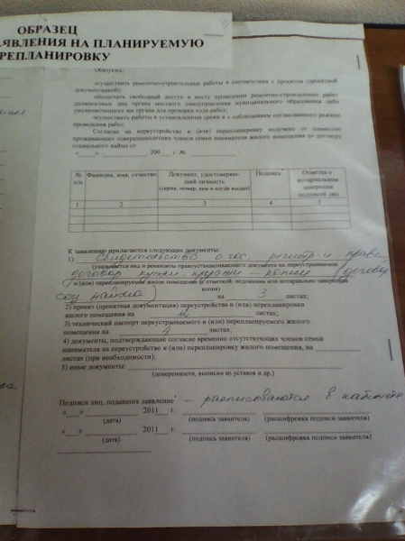 Вдруг кому-то понадобится, выкладываю образец заявления на перепланировку и список документов предоставляемых в ДАиГ, Срок рассмотрения заявления от 30 до 45 дней.