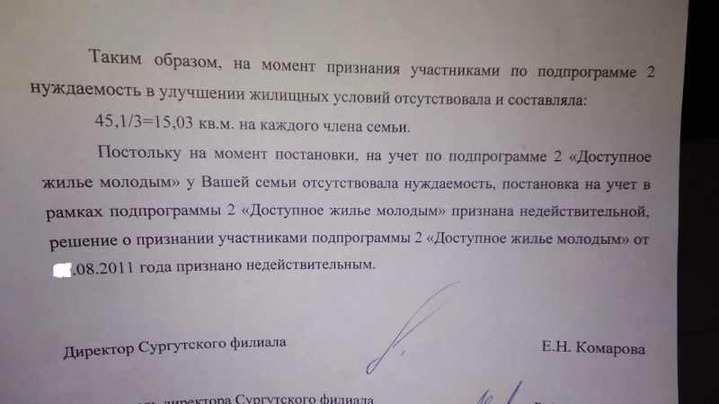 Вожак шопоголиков писал(а): : 12.12.2018 13:14 zhuzhu83 бред какой то... сначала признают нуждающимися, а потом уже квартиру покупают.. Как у вас наоборот то получилось? квартира больше у всех, по другому быть не может просто технически, потому как ипотеку дают только при соблюдении условий - минимум 12 кв на человека. а вы пишите об обратном. ![]() и даже мат.кап не дадут вложить, если нет по 12 кв на каждого. ![]() Все верно, нас признали нуждающимися, мы купили согласно программе квартиру по ипотеке 45 кв., в 2011 году поставили ребенка на субсидию, нас уверили, что все в порядке и все хорошо. В 2016 году также второго поставили в очередь и опять нас уверили, что все ОК. И только вчера получили ответ, что оказывается при постановке в очередь на субсидию квадратуры хватало на троих и мы исключены. Скидываю письмо. И я не одна такая, вчера разговаривала с девушкой, та получила такое же письмо.