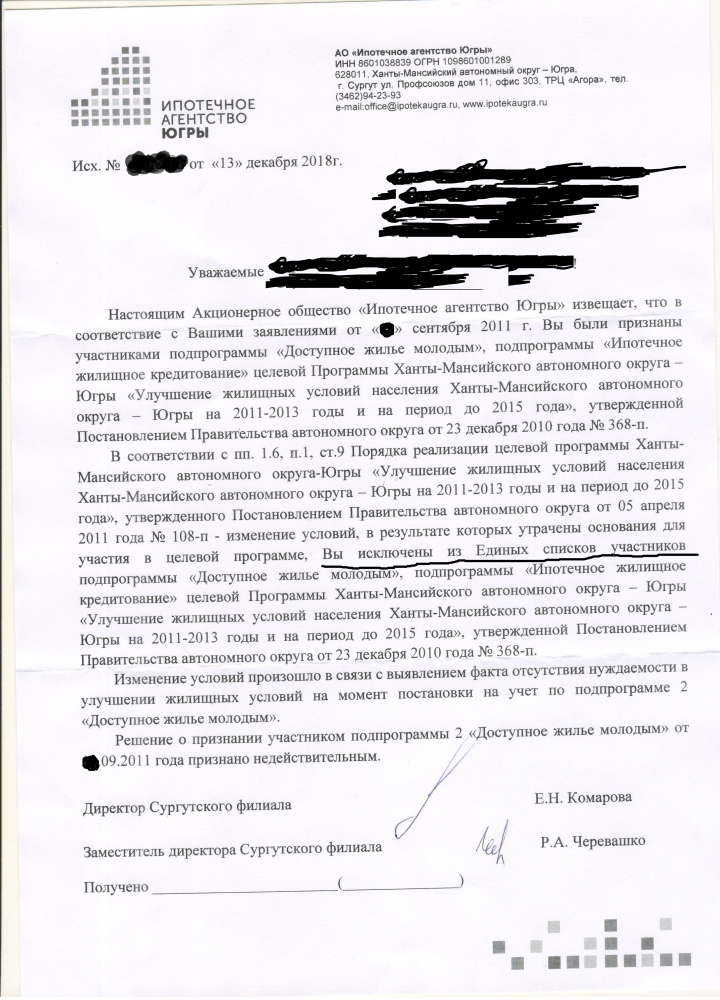 masterkey писал(а): : 28.12.2018 2:12 sokrovi6e писал(а): : 27.12.2018 12:43 lisa_elenka писал(а): : 18.12.2018 9:15 masterkey писал(а): : 18.12.2018 1:45 Здравствуйте, девочки, подскажите, в сентябре 2011 нас признали нуждающимися, квартиры вообще не было никакой,снимали, встали в очередь на получение субсидии, затем в 2012 году купили квартиру 64,7 кв.м., в 2014 году родился 1ый ребенок, поставили в очередь, а в 2017 родился второй ребенок и тоже поставили в очередь, мы в пролете,да!? ![]() В пролете на субсидию только те, кого сначала без ребёнка признали нуждающимися, они купили без ребёнка квартиру по квадратам больше чем 36кв (на троих членов семьи) потом родили и поставили на очередь ребёнка. Поэтому ипотечка считает, что уже раз на момент рождения ребёнка, квартира с достаточным количеством квадратов была, значит ребёнок уже не нуждался в субсидии. А Вы, по сути, просто в программе компенсации процентов за ипотеку. Как-то так. Получили сегодня письмо с ипотечки, о том, что мы исключены именно по той ситуации, как Вы описали выше. В 2011 - есть уведомление, что положена субсидия, проходит 7 лет. В 2018 году - не нуждаемся, т.к. квартира была куплена в 2010 и всем хватает квадратов. Как так? Причем в 2010-2011 году в ипотечке говорили о том, что государство покупает ребенку квадраты! О нуждаемости ничего такого не было! Есть у кого-то контакты юристов, кто занимается подобными вопросами? а мы 10.09.2011 встали...по ходу и до нас добирутся...а вам претензию не прислали о возврате суммы возмещения процентов за все эти года!? Я ничего не понимаю, одним из условий было покупка квартиры больше чем 12 кв.м на одного.Не наддо все в кучу собирать и путать. так и рождаются слухи. возврат КПС сейчас начинают требовать только с тех, кто НА МОМЕНТ ВСТУПЛЕНИЯ в программу уже имел какую-то недвижимость в собственности за пределами ХМАО, причем по квадратуре превышающую 12 квадратов на каждого члена семьи. А те семьи которые без детей вступили в программу, взяли ипотеку с КПС, купили жилье по квадратуре превышающую по 12 квадратов на каждого, потом родили ребенка и поставили его на субсидию, тех считают, уже ребенок не нуждается в квадратах и их исключают с очереди на субсидию, КПС при этом остается. (надеюсь не коряво написала )