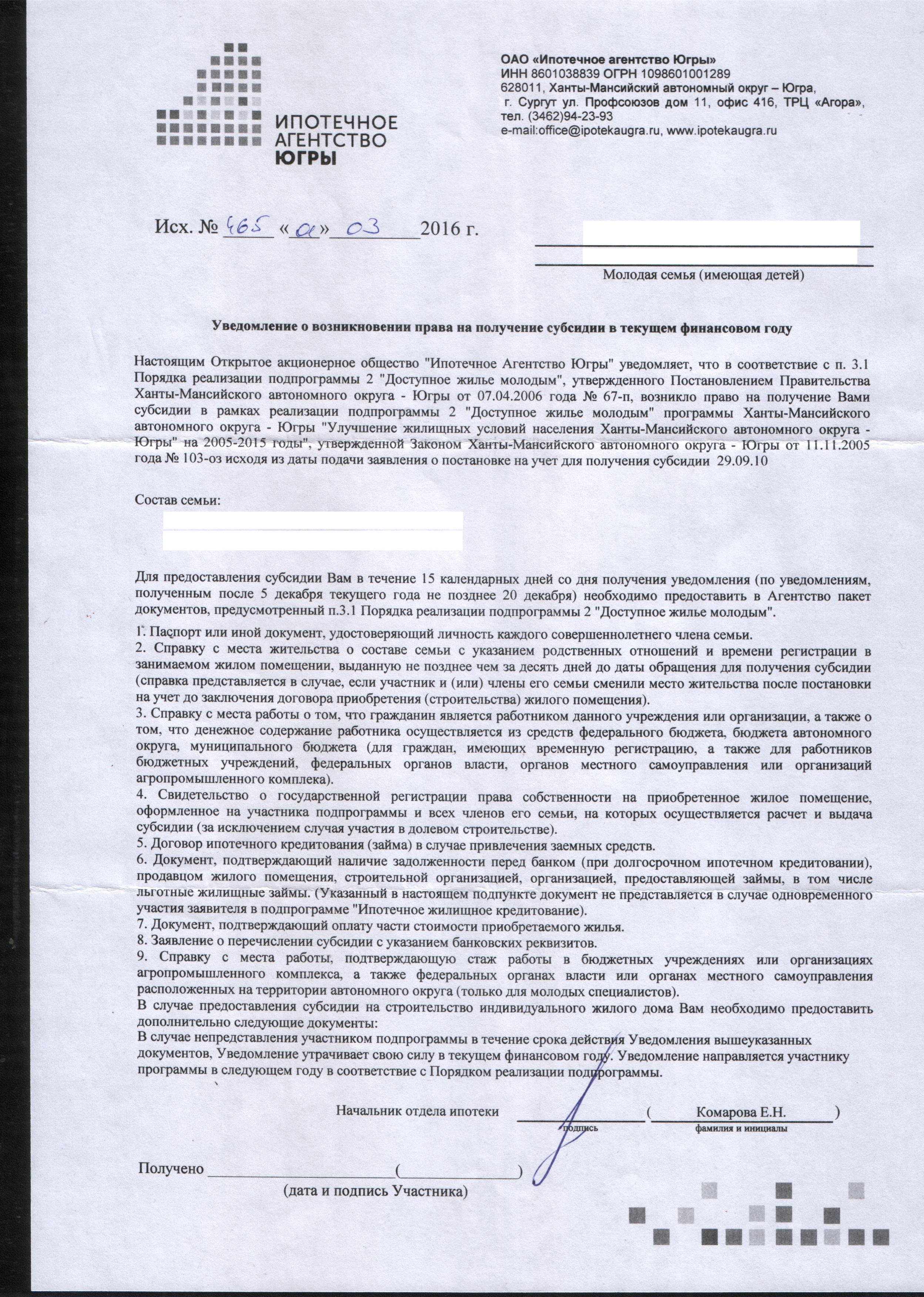 Если, пока вы ожидаете субсидию, в семье родился малыш... Развернуть/свернуть.. Нужно предоставить в ИАЮ свидетельство о рождении ребенка с вкладышем о гражданстве (в случае наличия), либо документы, подтверждающие усыновление ребенка. Необходима также справка с места жительства (ребенок должен быть прописан). С собой надо иметь уведомление, в котором значится один ребенок (они его переделают, добавят еще одного ребенка). ИАЮ самостоятельно запросит у органа, осуществляющего государственную регистрацию прав на недвижимое имущество и сделок с ним, сведения о наличии или отсутствии жилых помещений в собственности у вновь рожденного (усыновленного) ребенка