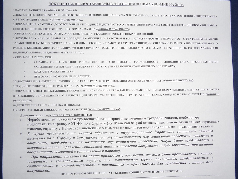 -Паспорт заявителя (копии страниц первой (фото) и страница с пропиской); -Документы граждан, совместно проживающих по адресу заявителя, а также документы, подтверждающие родственные отношения (паспорт, свидетельство о рождении, свидетельство о браке или о расторжении брака, установление опеки и т.д.); -Документ на квартиру (договор о приватизации, свидетельство о регистрации, договор соц.найма, договор поднайма и т.д.); -Доходы за последние шесть месяцев всех членов семьи (в том числе дополнительная пенсия, выплачиваемая неработающим пенсионерам через организации, пособия, компенсации); -Трудовая книжка для неработающих граждан (копии страниц первой и последней с записью об увольнении); -Пенсионное удостоверение (при наличии); -Справка об инвалидности (при наличии); -Лицевой счет в кредитном учреждении г. Сургута (Аккобанк, Ханты-Мансийский банк, Сбербанк) заявителя, обратившегося за субсидией cвернуть наверх