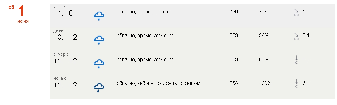 Цитата: Погода для жителей Югры на праздники приготовила сюрпризы в виде снега и сильного ветра 1 и 2 мая на территории Югры ожидаются осадки в виде дождя и мокрого снега. Об этом сообщает Ханты-Мансийский центр метеорологии и мониторинга окружающей среды. Однако, как отмечают синоптики, "осадки будут умеренными". Местами в отдельных районах ХМАО возможны порывы ветра до 15 м/с. Температура в первые майские праздники не превысит отметки в +10 градусов Цельсия. Ночью в северных районах столбик термометра, наоборот, может опуститься до – 10. Празднование Дня Победы может немного омрачить дождь, который ожидается в большинстве территорий Югры 9 мая. Температура воздуха в эти праздничные дни будет от +10 до +16 днем, а ночью может опускаться ниже нулевой отметки. http://www.ugra-news.ru/frontpageart/27800 |