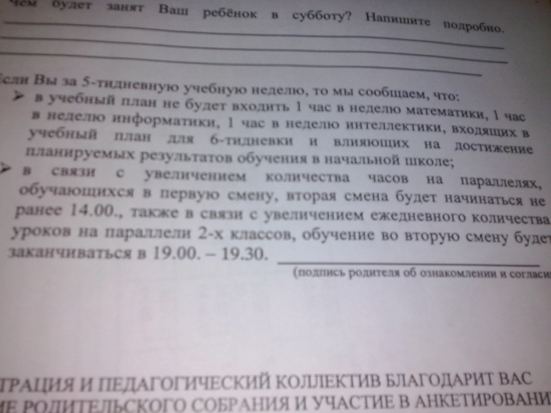 Это,простите, не анкета. У нас было примерно так:посещает ли ребенок спорт.секции? Сколько времени тратится на выполнение дом.задания? Зачем вам 5 дневная учебная неделя? Согласны ли Вы,чтобы допы были вынесены на субботу на свободное посещение и все в том же духе. Все анонимно,ди те принесло домой,вместе почитали,ответили, и отнеслиси обратно в школу.Класс 100 % за пятидневку. |