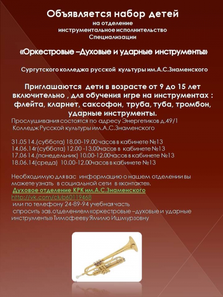 Есть дополнительные места на отделении духовых инструментов в колледже Знаменского. На прослушивание приглашаются дети 9-15 лет.