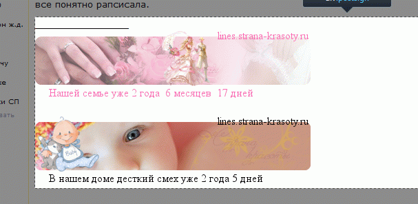 Включена обрезка длинных подписей, ограничение 250px. Если длина подписи превышает, тогда появляется линия отреза. Вот подпись высотой 250px Вложение: А вот подпись обрезанная, что там ниже линии уже не видно. Вложение: Если ваша подпись обрезается, то ищите способы уменьшить текст или картинки. Часто, выводимые вертикально картинки можно разместить горизонтально убрав только переносы строки между ними.