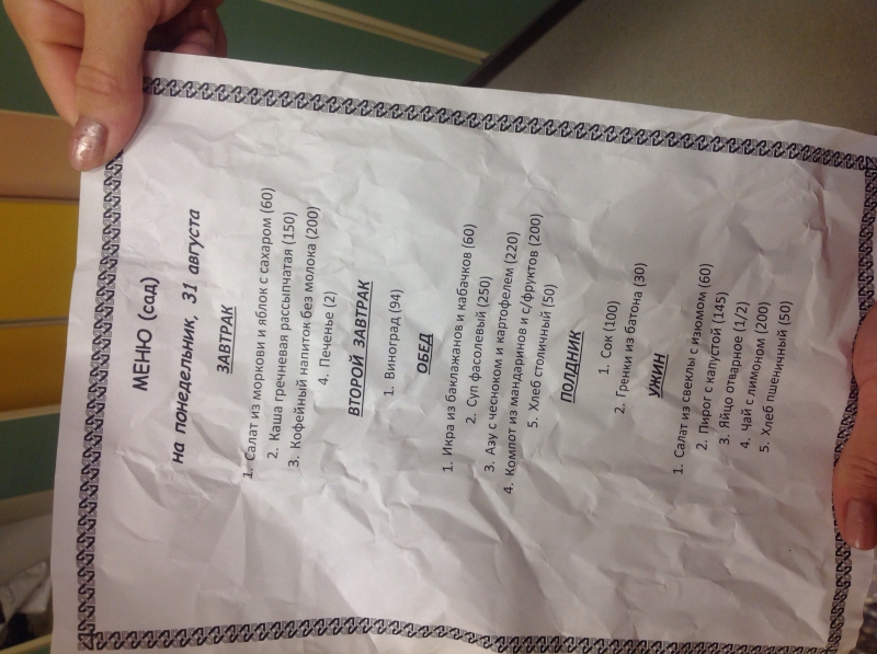 Ну я сама меню эти напечатала! и не забыла строчки с фруктами удалить.Мы начали ходить с конца июля, не с открытия, на море были в отпуске. Так вот когда вышли я видела в меню нектарины давали по 1 шт, а потом фрукты стали исчезать и сплошная капуста свекла морковка Сегодня 1/4 апельсинки - это 2 дольки?! И в обед салат из консервированных огурцов и помидоров Я бы хотела чтобы детям давали свежие овощи и фрукты, а не микроскопические дозы 1/3 или 1/4. И каши на завтрак полноценные молочные, масло, сыр. Говорить что на это не хватает финансирования теперь бессмысленно Мне удобен этот сад, мой ребенок там проводит много времени, и я хочу его любить, хвалить и восторгаться Но пока минусы все таки присутствуют к сожалению Я надеюсь в ближайшее время все встанет на свои места, и будет именно так как я и хочу ![]()