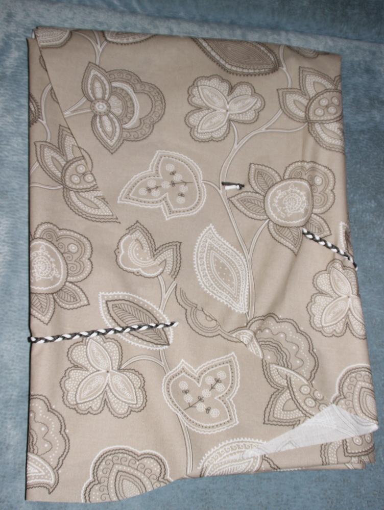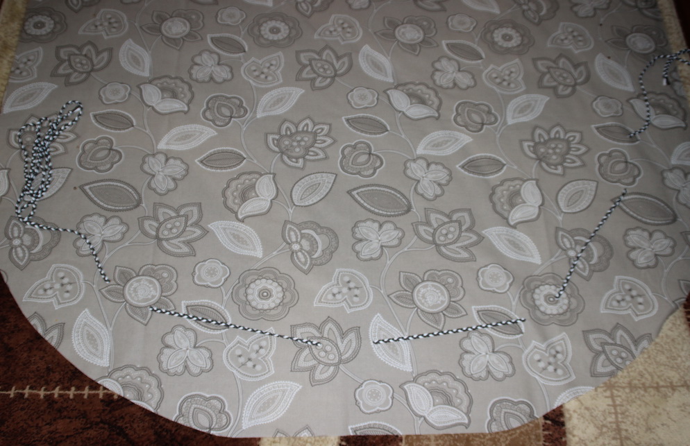 Скатерть на кухонный стол. Где-то пару лет назад озадачилась тем, как мне сделать так, чтобы скатерть на столе сидела плотно, чтобы садящийся за кухонный стол не сдвигал скатерть и чтобы подрастающая и начинающая сама ходить дочь не сдергивала её [скатерть]. Идей в голове крутилась масса. Живучей оказалась наипростейшая идея: продеть в скатерть обычный шнур и стянуть его под столешницей. Благо, модель стола позволяет стягивать: ножки стола не препятствуют стягиванию скатерти. Я не покупала готовый шнур, я сплела шнур обыной косичкой. Фишка тут в том, что какой бы шнур вами не использовался, он должен немного тянуться, как, например, мой, который очень напоминает обычный среднестатистический синтетический шнурок.