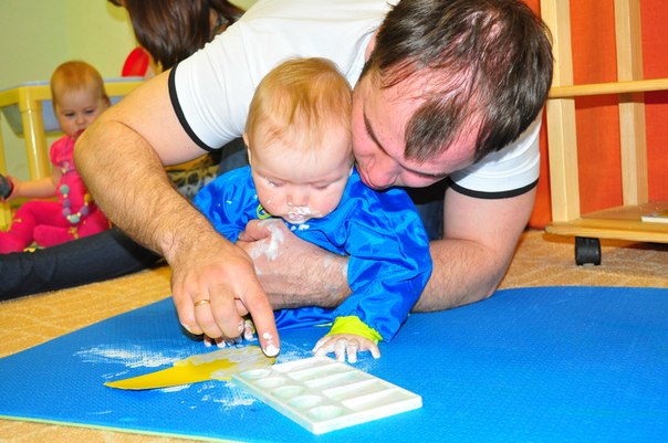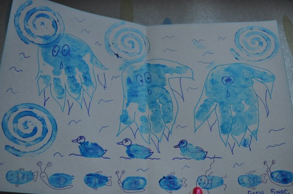 Существует много техник использования этих красок, которые можно освоить с малышом. Рисуем ладошками Для этого лучше налить слегка разведенные водой краски в пластиковые тарелочки, чтобы ребенку было удобно окунать ладошку в краску. На бумаге можно делать отпечатки ладони, проводить ладонью разные линии, закрашивать большие поверхности. Если рисуете в альбоме, то под отпечатком ладошки на память можно поставить дату или возраст ребенка. Ладошкой можно мазать, рисовать и печатать любые абстракции, наслаждаясь цветом или создавать сюжетные картины. По-разному поворачивая ручки, и дорисовывая к отпечаткам недостающие элементы, можно воплотить любые задумки. Например, отпечатав сомкнутую ладошку можно получить силуэт рыбки. Останется только дорисовать ей пальчиками глазик, плавники и хвост. Рядом с рыбкой можно отпечатать пальчиками камушки и провести волнистые линии, изображая водоросли. Ладошка, с разведенными пальчиками, смотрящими вниз, позволит увидеть в рисунке осьминога, если дорисовать ему глазки и ротик. С помощью отпечатков ладошек, сделанных по кругу, можно изобразить солнышко и цветок, дорисовав сердцевину, по полукругу - ежика и опушку из травы. Полураскрытый кулачок может напечатать дугу. Несколько таких отпечатков разного цвета - и готова радуга. Две ладошки с сомкнутыми между собой большими пальцами и отведенными по диагонали остальными (прижатыми друг к другу) могут дать отпечаток бабочки, если дорисовать им длинные усики и точки на крыльях. Рисуем пальчиками. Для рисования пальчиками, прекрасно подойдут баночки, в которых, обычно, пальчиковые краски и продаются. Всей ручкой малыш в них залезть не сможет, поэтому, будет брать краски именно пальчиками. Пальчиками, можно оставлять следы, как ладошками, можно рисовать узоры, или простые «каракули» – все равно будет получаться очень красиво и необычно. Попробуйте обмакнуть каждый пальчик малыша в разную краску и провести сразу всеми по бумаге, обычно, дети в восторге от такого разноцветного шедевра. Ещё один вариант: когда мама рисует что-либо на бумаге (рисунок не должен быть четким и без мелких деталей), а малыш его раскрашивает. Можно просто обмакивать пальчик крохи и позволить ему «творить» самостоятельно. Примеры Не транжирь время - из времени сделана жизнь. ( Скарлет ОХара) |